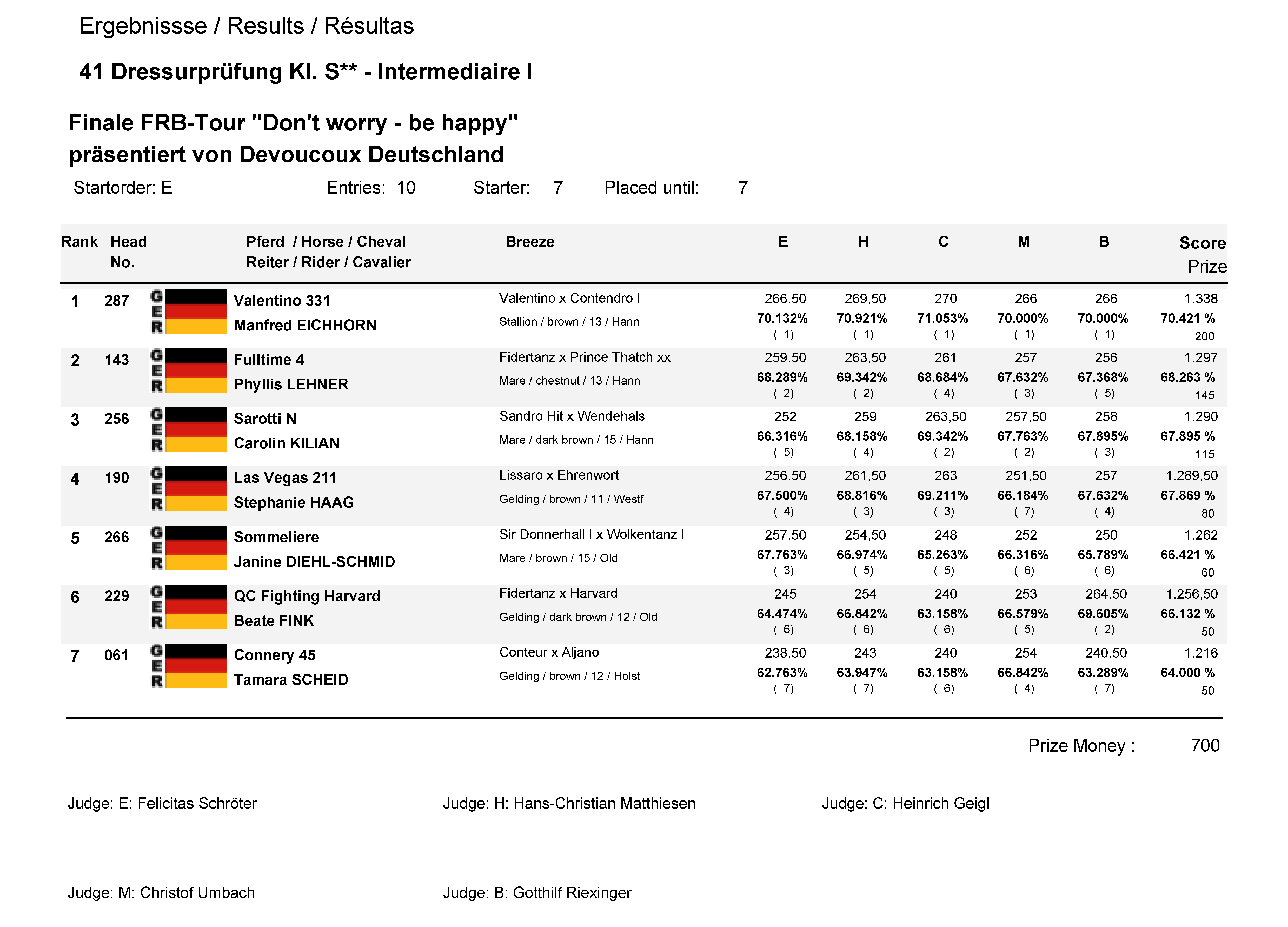 Sieger unserer S-Serie „Don’t worry – be happy“ wurde mit über 70 % in der Intermediaire I Manfred Eichhorn, gefolgt von Phyllis Lehner und Carolin Kilian – tolle Ritte auf dem Olympia-Viereck – herzlichen Glückwunsch!