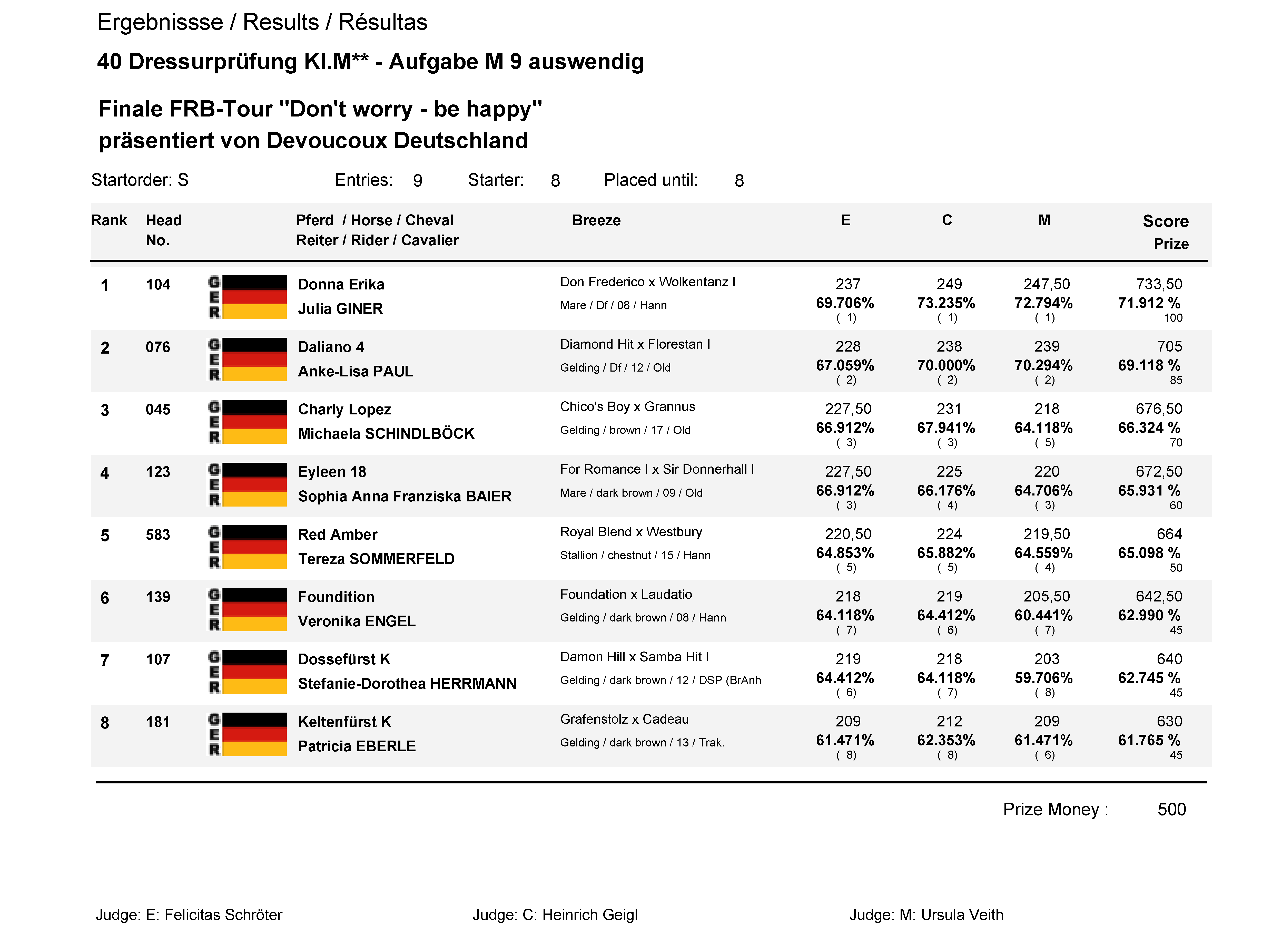 Julia Giner gewann mit fast 72 % das Finale der FRB „Don’t worry – be happy“ M-Serie eine M**, gefolgt von Anke-Lisa Paul und Michaela Schindlböck – herzlichen Glückwunsch!