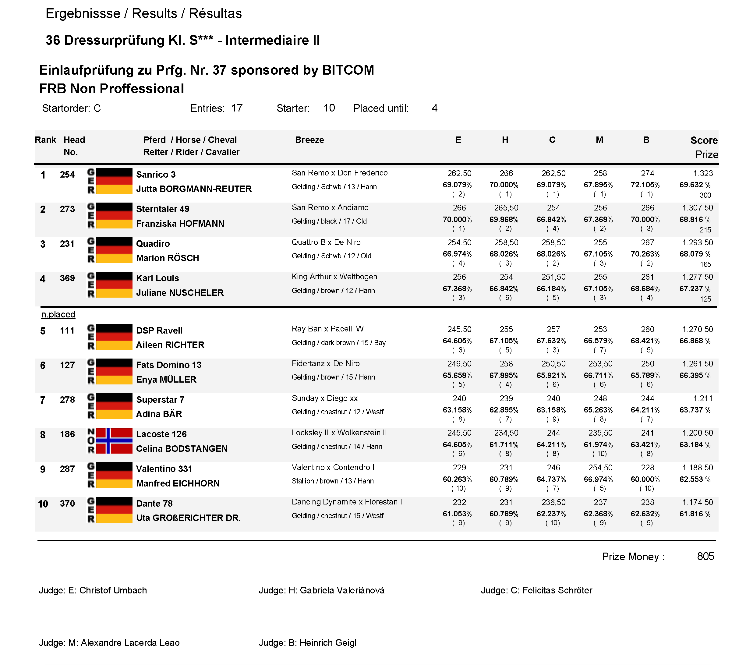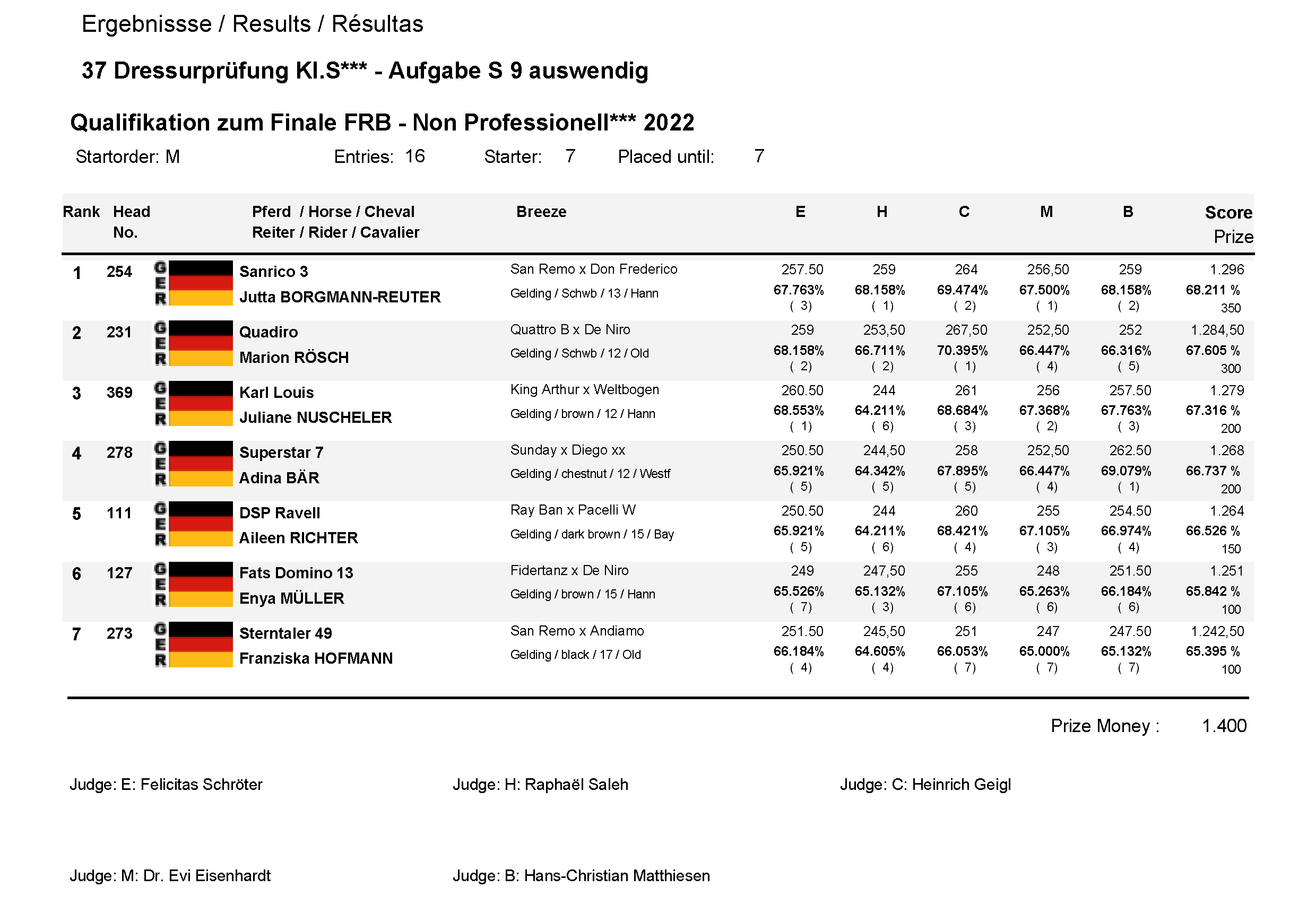 Die große Siegerin sowohl der Einlaufprüfung wie auch der 2. FRB – S*** – Amateur-Prüfung des von Felice Schröter ins Leben gerufenen FRB Non Professionals S***- Amateur-Cups ist Jutta Borgmann-Reuter, gefolgt in der Einlaufprüfung von Franziska Hofmann und Marion Rösch.